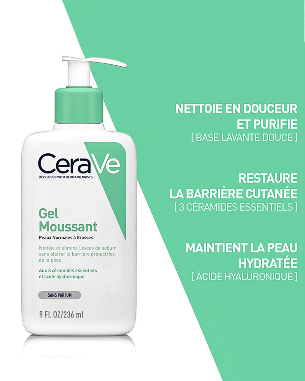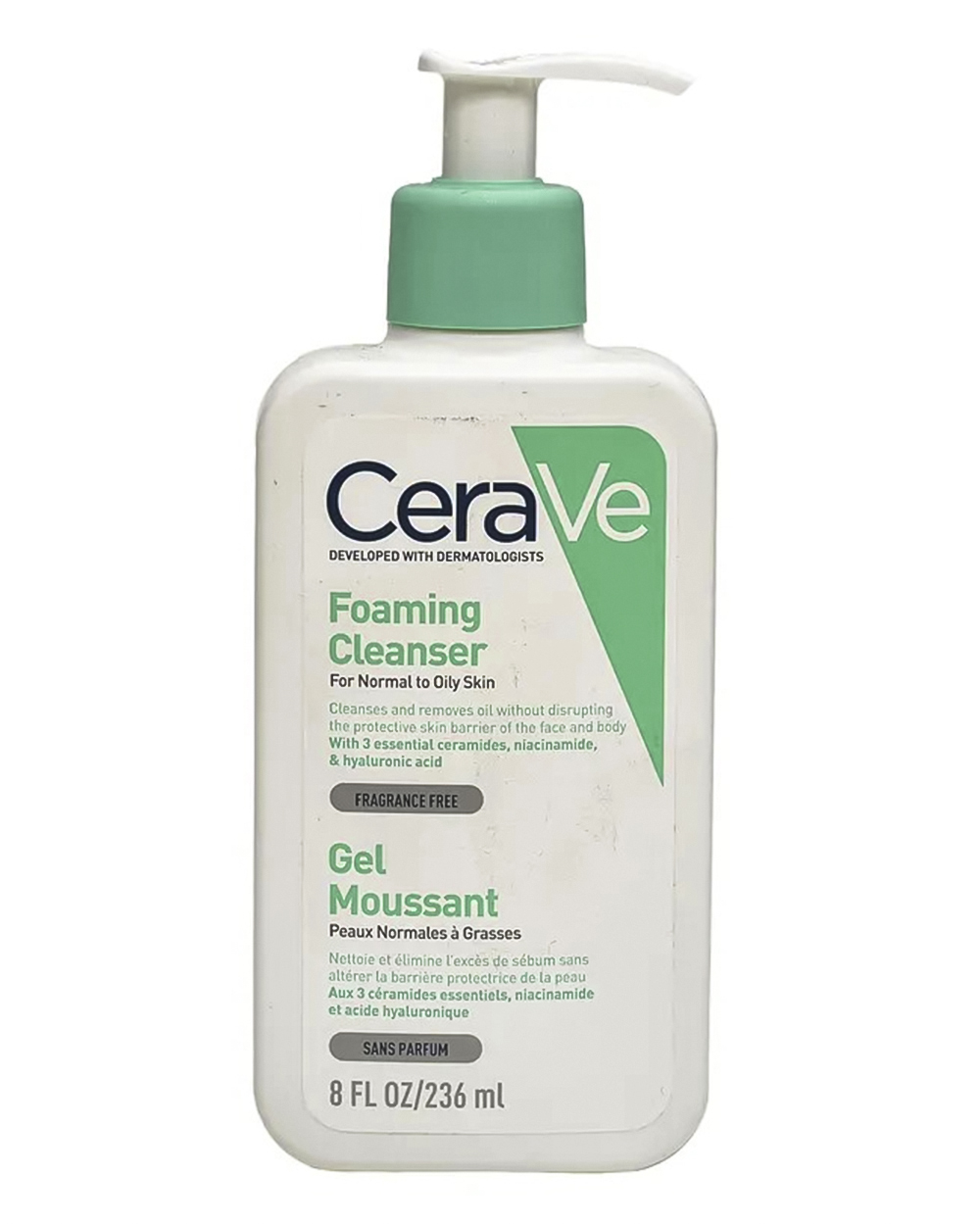 CeraVe®, Очищающий гель для кожи склонной к жирности интенсивно очищает, удаляя излишки кожного сала, загрязнения и макияж.