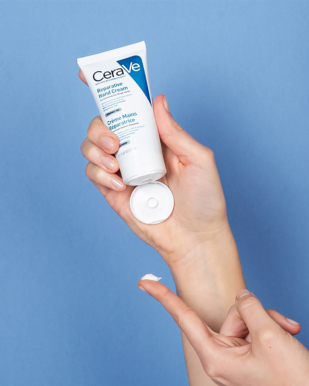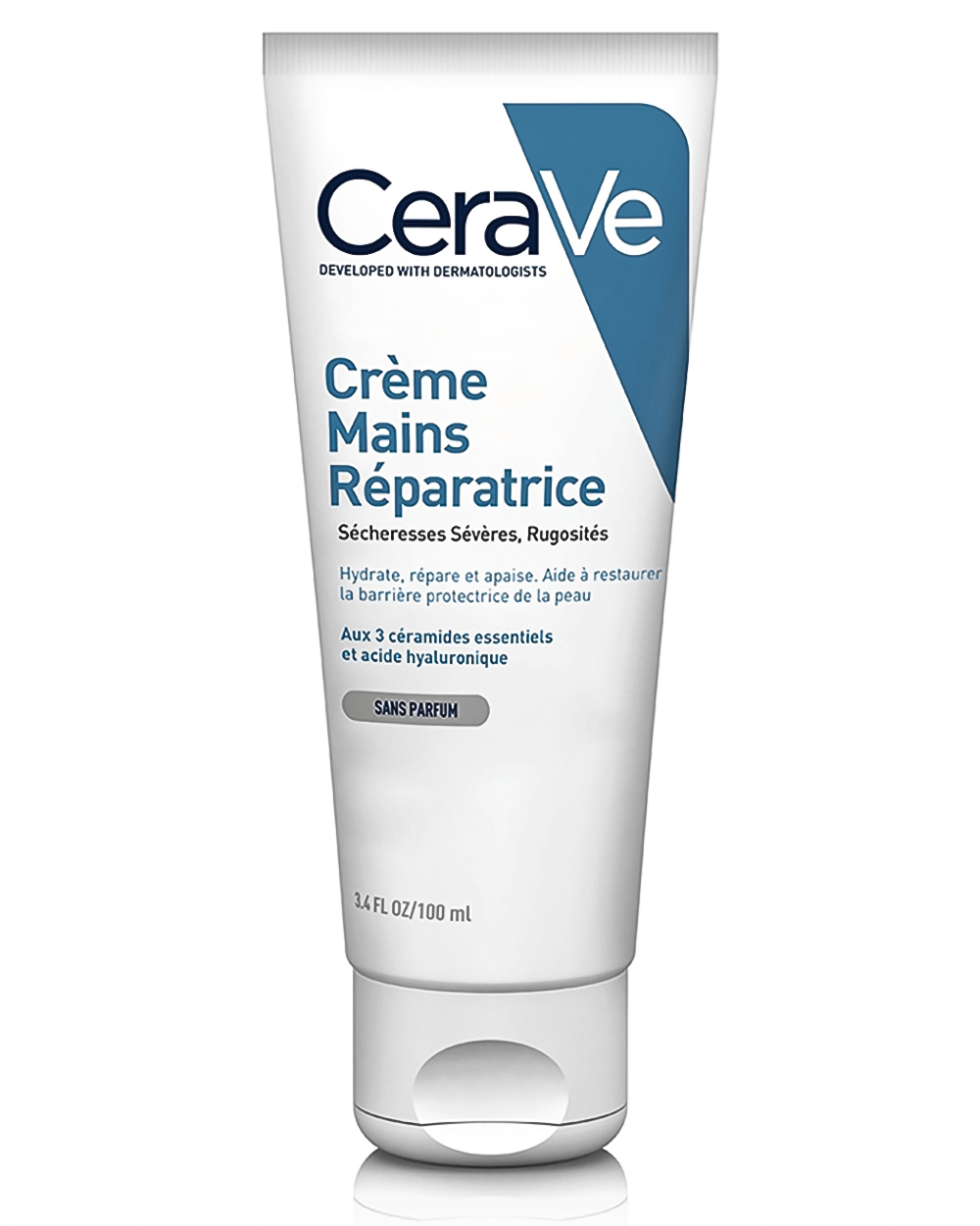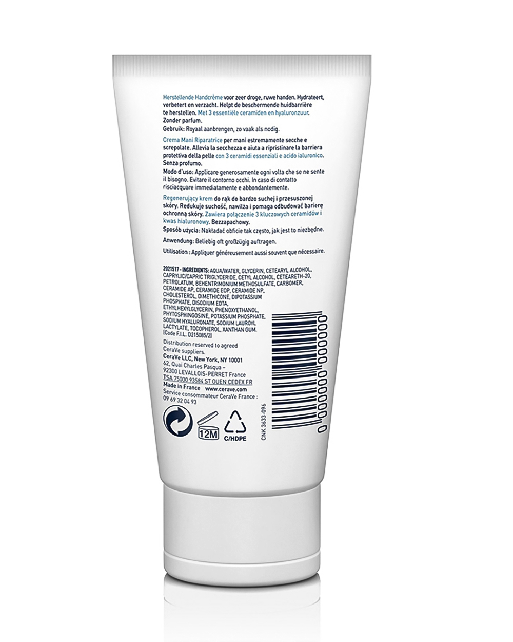 Восстанавливающий крем для рук от CeraVe — это увлажняющий, питательный и восстанавливающий крем для рук от сухих до очень сухих, поврежденных или ослабленных в результате ежедневных воздействий. Он обогащен гиалуроновой кислотой для поддержания увлажнения кожи, ниацинамидом для успокоения и 3 необходимыми керамидами для восстановления кожного барьера. Благодаря технологии MVE, которая инкапсулирует увлажняющие активные вещества и непрерывно распределяет их, она увлажняет 24 часа в сутки. Его текстура нежирная, не оставляет липкого эффекта и делает руки гладкими и мягкими.